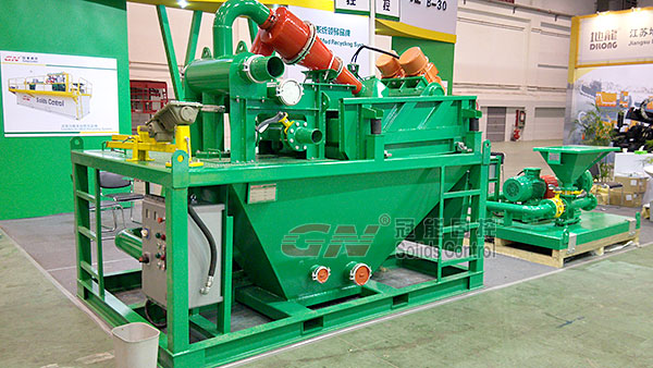本次展會主要展出了120m³/h處理量的泥漿回收系統(tǒng)及配套的射流混漿系統(tǒng),主要配置了一臺GNZY753E-Y1S型篩泥一體機,雙層篩網設計,面積達到2.225m³,可分離固相粒度40微米,旋流器采用高質量聚氨酯材質,耐磨,使用壽命長,振動電機采用國際意大利OLI品牌或者美國馬丁品牌,篩箱底框采用不銹鋼材質,振動強度達到7.1G(可調),并配有GNSB6×5A(37KW)離心泵為除泥供漿泵,采用機械密封,使用壽命長并便于維修。整套系統(tǒng)撬裝設計,移動便捷,使用方便。