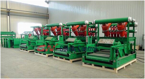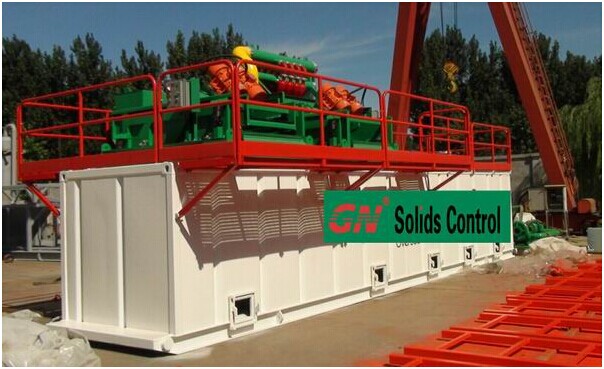 冠能150GPM泥漿系統(tǒng)配置如下 1、1臺GNZS703D雙層振動篩上安裝了3個4寸除泥旋流器,通過GNZS703D雙層篩可以把粗砂除去,然后通過除泥旋流器把20um左右以上的顆粒在分離除去, 2、2臺GNSB4X3-12J的砂泵安裝在泥漿罐斜倉上,1臺用于給除泥器供漿,另外1臺作為混漿泵使用。 3、4米長的泥漿罐,非常緊湊的設(shè)計跟合理的布局,對于狹小的鉆井空間非常適宜。