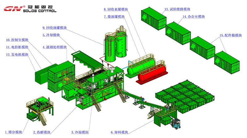 型號(hào) GNTDU-35A 處理量 3.5 - 5.0 噸/小時(shí) 處理完固體含油量 0.3%-1%依據(jù)用戶需求 主要模塊單元 篩分模塊、熱解模塊、冷凝模塊、液相處理模塊、冷卻塔模塊、卸料模塊、柴油罐模塊、