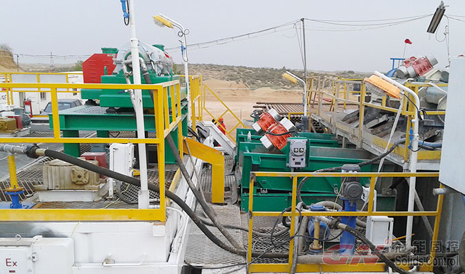 兩臺高G干燥篩放置于低高度的泥漿罐上面,在把整個干燥裝置放置于鉆機的振動篩下面。